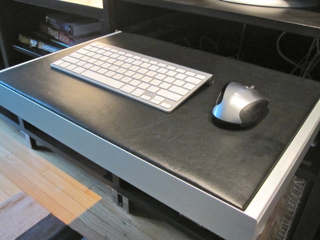 There was, however, one small problem. My original vision called for replacing the cheap desk and putting my Mac Mini in the BESTA unit, and my keyboard and mouse (both wireless) on an INREDA pull-out frame with the shelf insert option. The INREDA pull-out frame could be fitted with one of three available options: a compartmentalized tray; a hanging file system; or a shelf insert. The shelf insert works perfectly for a laptop or small keyboard and mouse.